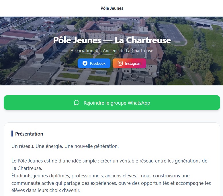 Le Pôle Jeunes est né d’une idée simple : créer un véritable réseau entre les générations de La Chartreuse. Étudiants, jeunes diplômés, professionnels, anciens élèves… nous construisons une communauté active qui partage des expériences, ouvre des opportunités et accompagne les élèves dans leurs choix d’avenir.